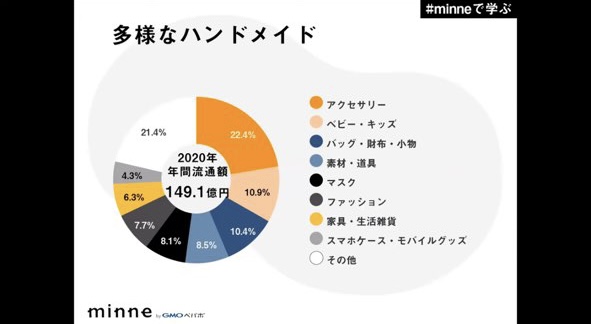 2020年、minne で流通したハンドメイドアイテムをジャンル別に分類したグラフです。
