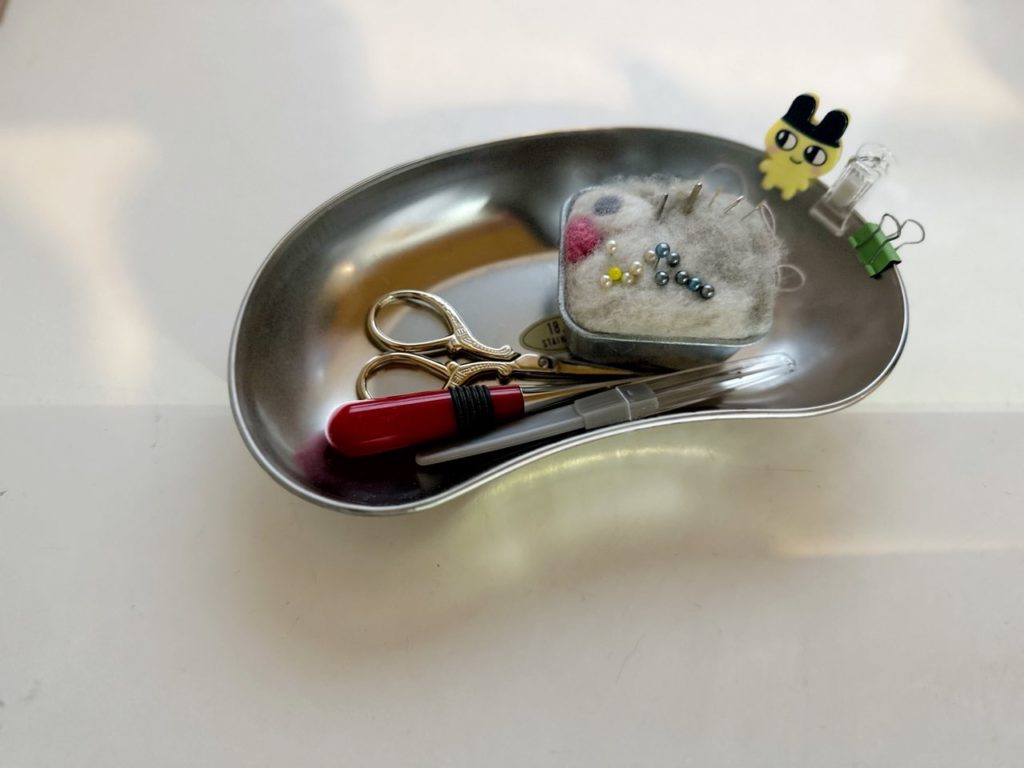 針山から右まわりに、クリップ、リッパー、目打ち、糸切りハサミ。