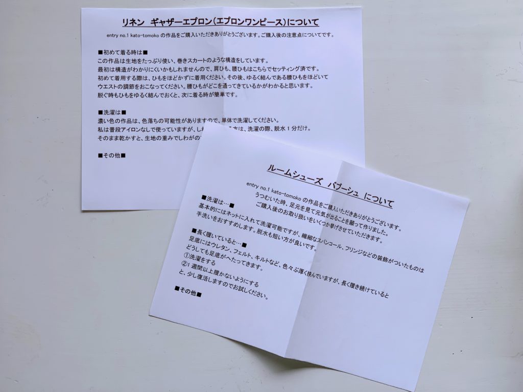 作品の洗濯方法やお手入れについて記載(Wordで作成)。