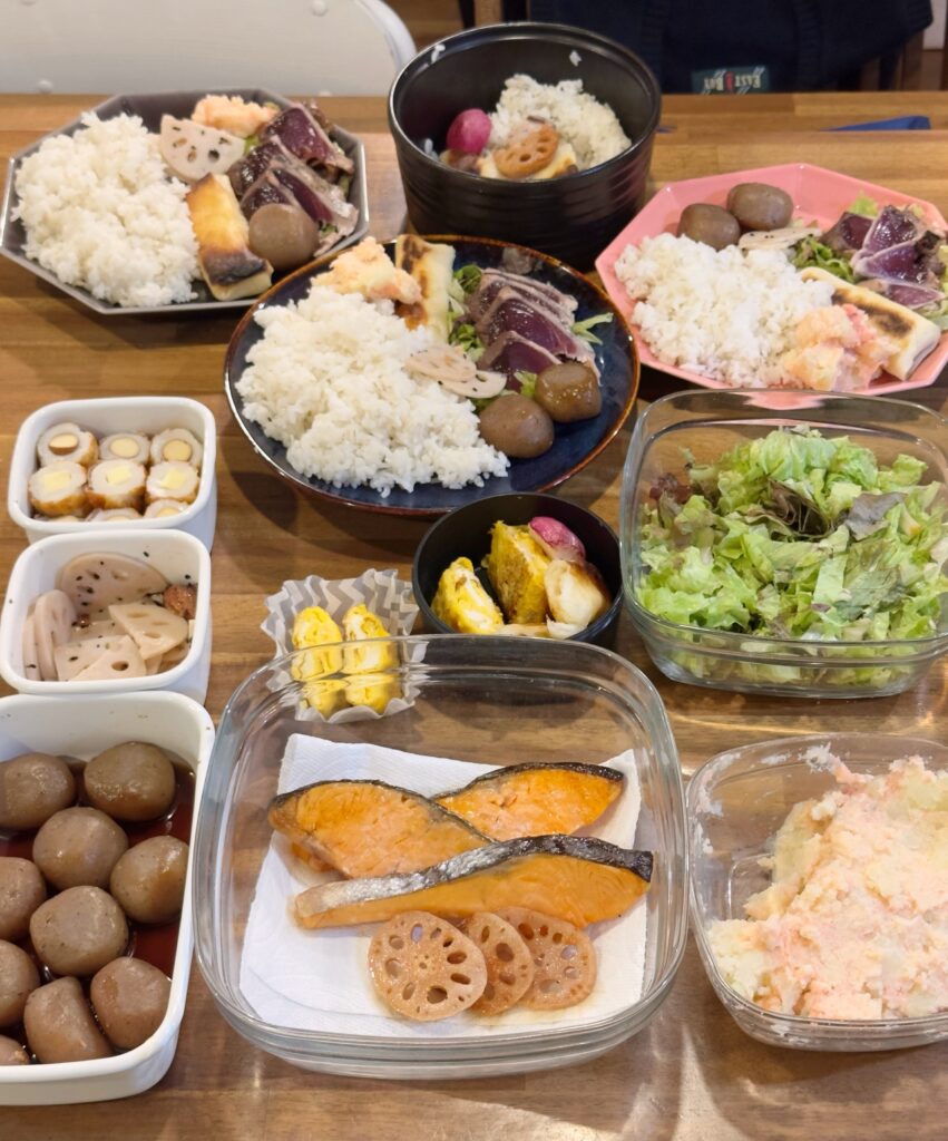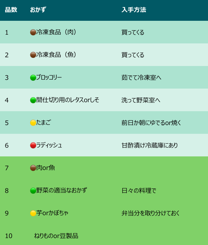 が、安心してください。10品のうち半分以上は、常備している簡単おかずと市販の冷凍食品。なので真面目に料理するのは4品。