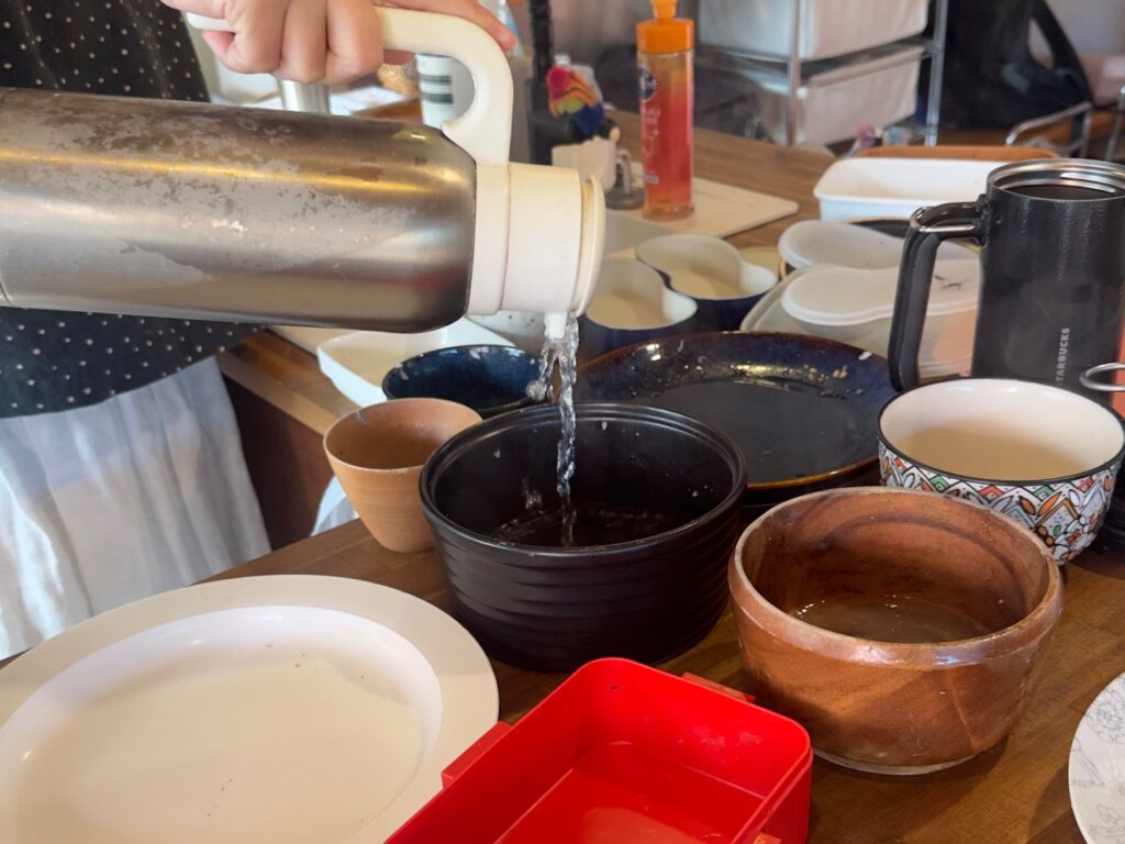いくら令和の洗剤でも、こんなカピカピに乾いた汚れは落とせないので、熱湯でふやかしていきます。