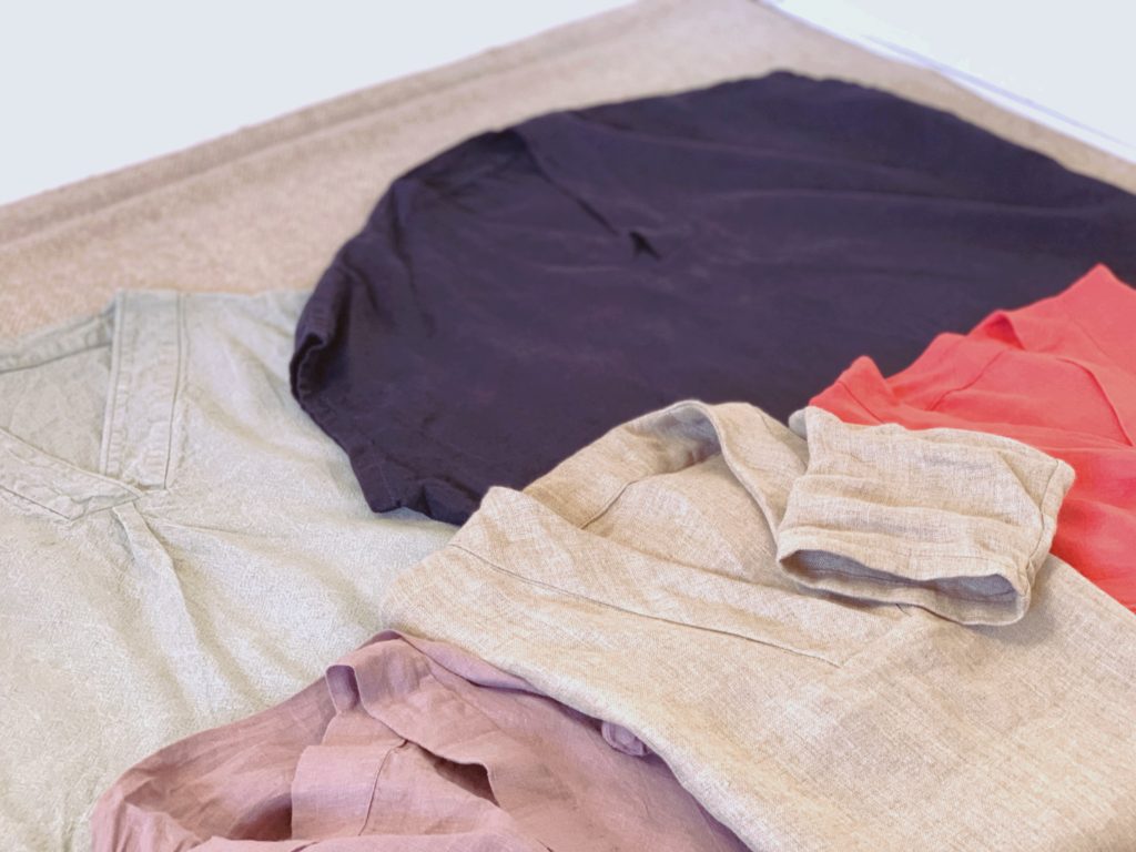 最初は小さく作っていたんです。でも世の流行を踏まえると、オーバーサイズでパンツにインできる方がいいだろう…と。そして生地はどんな質感のリネンにしよう。フレンチ?ベルギー?ガーゼ?と、着心地比べてを重ねているうちに、自分の私服がVネックプルオーバーだらけになる始末。でも、見ての通り、同じリネンでも全部質感が違うんです。なので同じ服ばかり着てるとは気づかれてないはず。