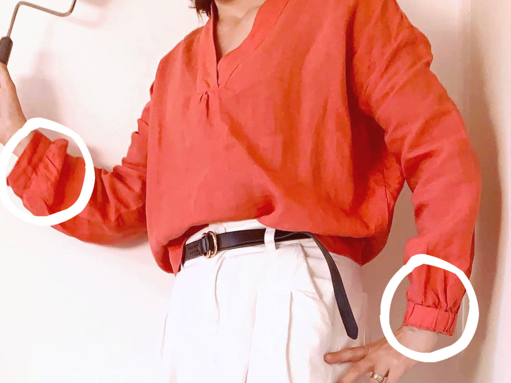 一般的なトップスには袖が2つあります。それを良いことに、左右の袖の形を変えて実験すること多々。例えば右袖はギャザー多めのゆったり袖、左手袖はギャザーなしのほっそり袖。あと、ゴムが入ってる右手首と、ゴムが入ってない左手首など。で、どっちの腕の方が着心地が良いか比べます。