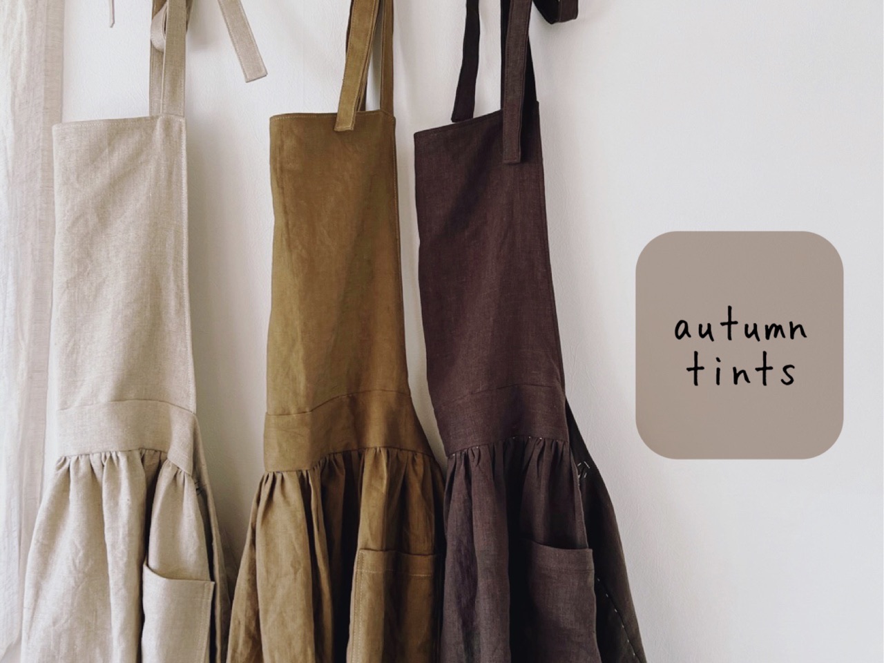 うちは山の中に家があって、紅葉とか落ち葉を見まくっているので、自然と落ち葉色を選んでいたのかも。エプロンは秋冬の自然に従った色で、濁ったり、暗かったりするんですが、白い壁にかけると、味があります。